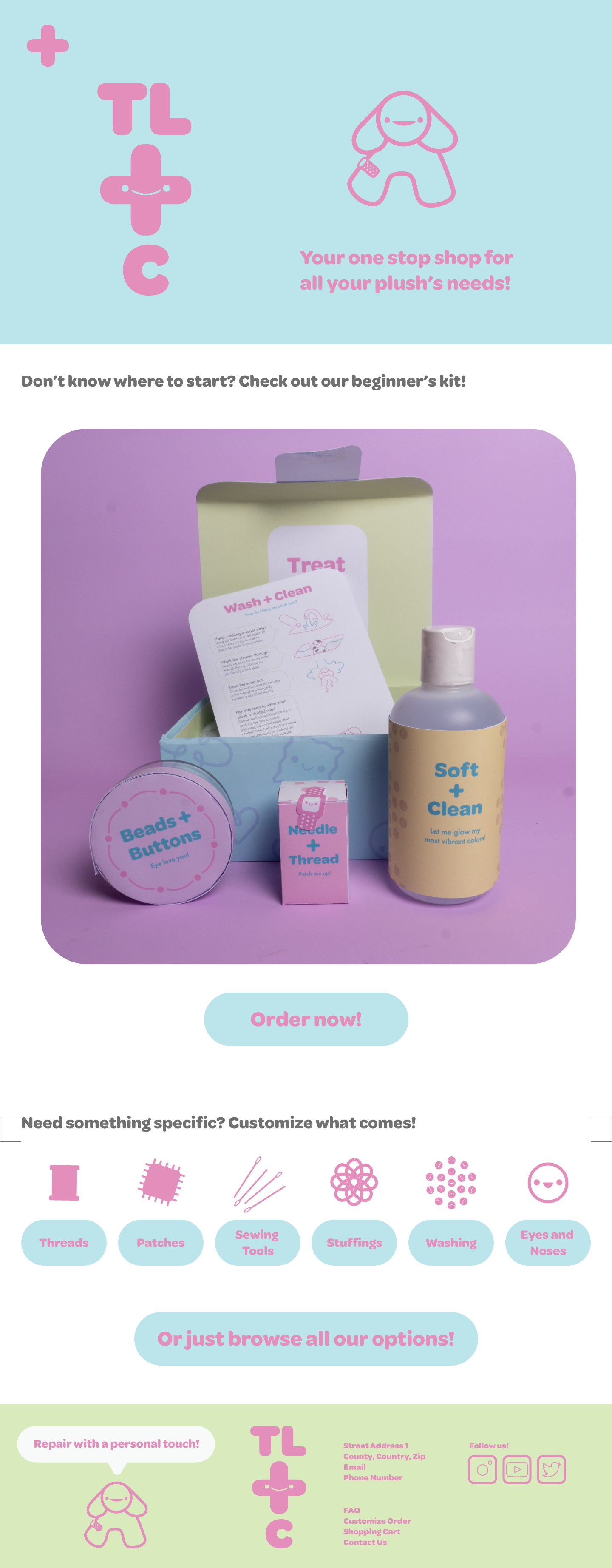 I also created a custom webpage for the brand, primarily selling the help kit but including some modifications for the kit, allowing customers to buy for their specific plush.